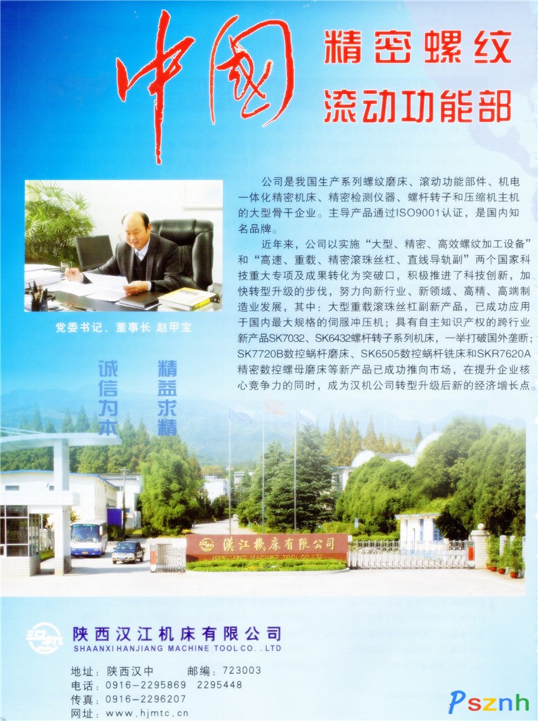 陕西汉江机床有限公司(原汉江机床厂)是国家第三个五年计划时期兴建的三线建设重点工程之一,机械工业大型骨干企业,国内螺纹磨床主导企业,一九六五年建厂。公司是国家科技重大专项主要承担企业之一,中国机床工具工业协会常务理事单位,中国机床工具工业协会滚动功能部件分会、磨床分会副理事长单位。