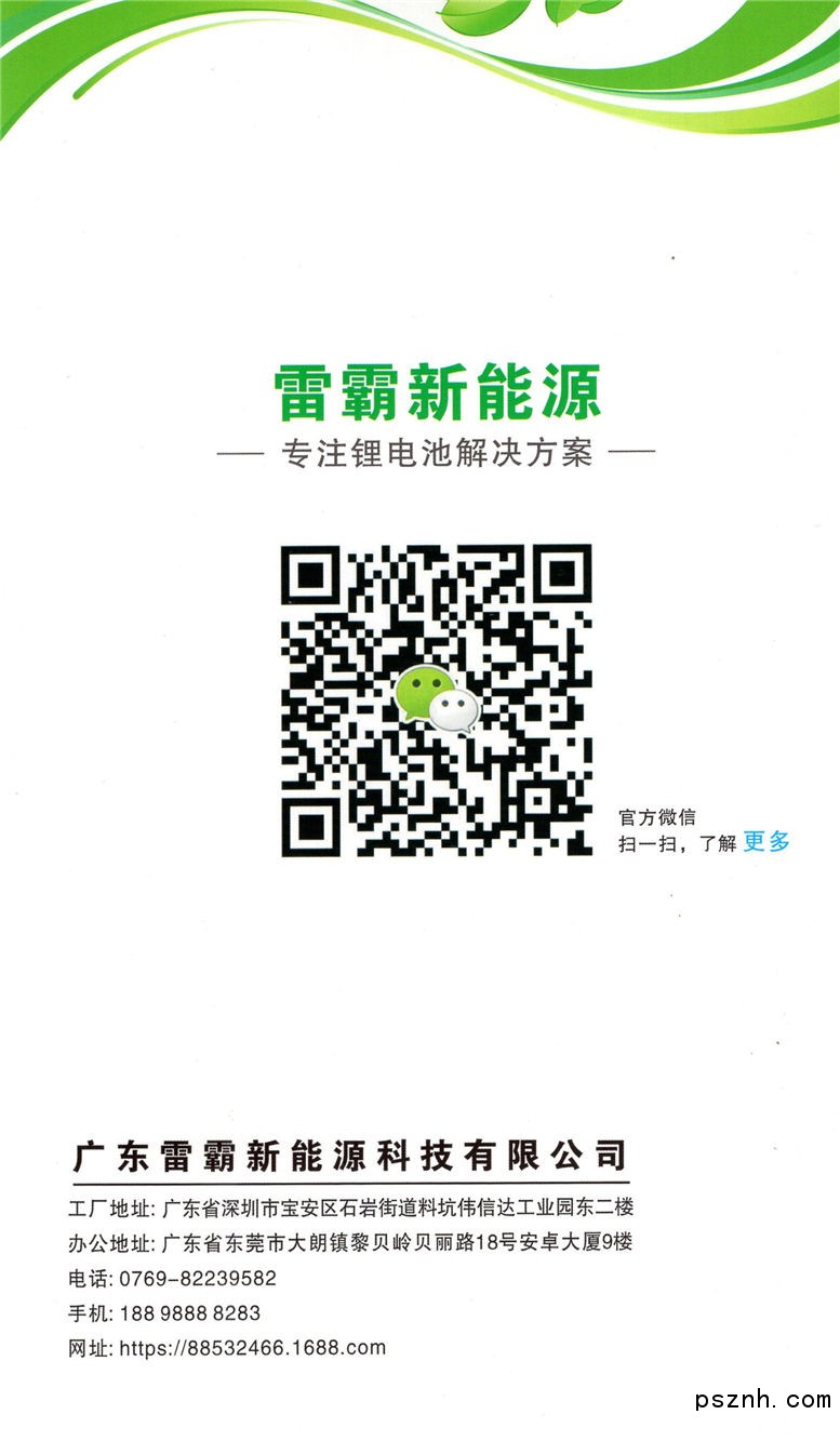广东雷覇新能源科技有限公司,本公司成立于2016年,注册资本1100万,主要研发、生产、销售各类锂电池及锂电池组。作为一家迅速发展的高科技公司,我们秉持精诚合作的企业精神,倡导简单和谐的人际关系;在研发上,我们始终坚持严谨、创新的科学态度;生产中,在使用现代化设备的同时,通过准军事化的管理,生产出质量合格的产品;在经营上,我们以服务共赢作为企业的经营理念;在售前,我们认真细致听取客户需求,为客户选择合适的产品, 提供适合的解决方案;在售后,我们耐心解答客户问题,及时、准确接收客户的反馈信息,改进我们的产品和服务,让我们的客户在激烈的市场竞争中处于有利位置,并抢占商机。愿与广大朋友携手共创美好的明天!合作共赢!精诚铸就品牌,悉心创造辉煌!联系电话:18898888283  0769-82839582