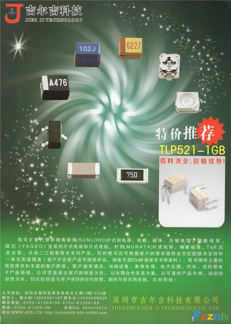 本司主要代理和销售顺络(SUNLORD)片式钽电容、电感、磁珠、压敏电阻、热敏电阻;国巨(YAGEO)片式电容和片式电阻;村田(MURATA)与TDK片式电容、电感磁珠;长电二三极管;光耦IC等全系列产品。同时我司还可根据客户的需求提供全方位的技术支持和一体化配套服务。所代理品牌产品技术指标均达到国际IEC标准,并通过了ISO9001、ISO14001、QC080000、TS16949、EICC等质量体系认证;