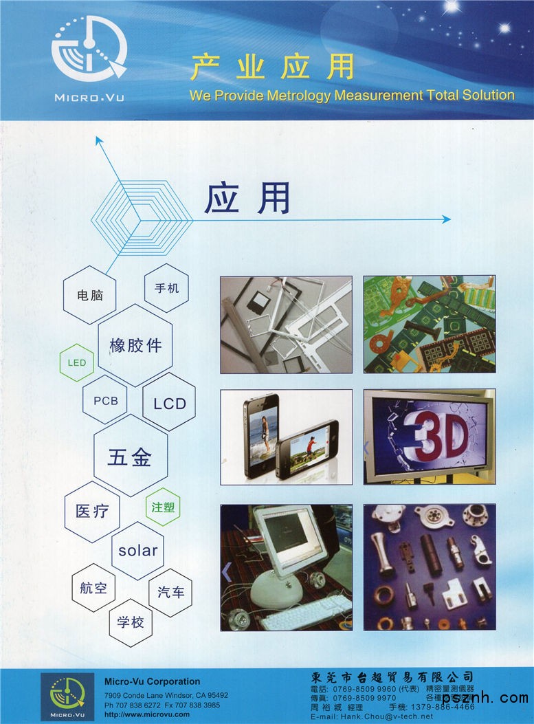 东莞市台超贸易有限公司從事精密量測儀器的銷售及服務有15年以上經驗,並以專門代理國外 儀器廠商產品為主。現以美國Micro Vu三次元量測儀器、Multisensor多測頭量測 系統、美國Navitar 光學鏡頭、美國ADE Phase Shift 3D奈米表面量測系統 (Nano-Mapping)及SPC 統計分析軟體之代理經銷,不僅奠定了豐富的銷售經驗 與專業維修技術,並獲得各界客戶的支持與信賴。 二、銷售主要產品: 非接觸式、接觸式三次元量測儀器、影像顯微鏡、光學投影機、粗度儀、硬度計、 原子能量分析儀、SPC統計分析軟體、品管設備及檢測度量衡軟體,所有產品符合 ISO/IEC ANSI/NCSL MIL-STD 等標準,並提供追溯及再校驗之認證。 三、我們的服務: 從第一次與客戶接觸起,我們的服務就已經開始。 在適用機種的選擇上,本公司提供最專業化的分析及建議服務。 貴公司產品量測需求的評估上,配合相關機型的示範展示,使您獲得最合用的數據。 在貴公司購入本公司產品後,本公司提供完整的售後服務,包含安裝、教育訓練及 保固…等,務求顧客之滿意保證。 我們秉持著誠信、積極、創新、感恩的理念服務所有的顧客,您使用上的滿意, 是台超成長的原動力。 四、產業應用: 1.精密橡膠塑膠:長度,寬度,高度,厚度,弧度,距離,正位度,色差分析,粗度分析 2.精密模具:長度,寬度,高度,厚度,弧度,距離,正位度 3.PCB:板厚,錫點直徑面積正位度,線寬,V-Cut, Lay out, 金手指,表面瑕疵觀察 4.光罩網板尺寸檢查,表面瑕疵觀察 5.半導體 封裝 導線架尺寸檢查,表面瑕疵觀察,照相 6.五金沖壓零件:長度,寬度,高度,厚度,弧度,距離,正位度,粗度分析,表面瑕疵察 7.汽車零件,通訊零件,手機零件,3C零件,Connecter零件尺寸檢查,表面瑕觀察 五、使用中的客戶群: 鴻海,英業達,旭麗,虹光,達方,楠梓電,明碁,全友,福懋,達碁,碧悠,勝華,嘉彰,台達 ……450多家