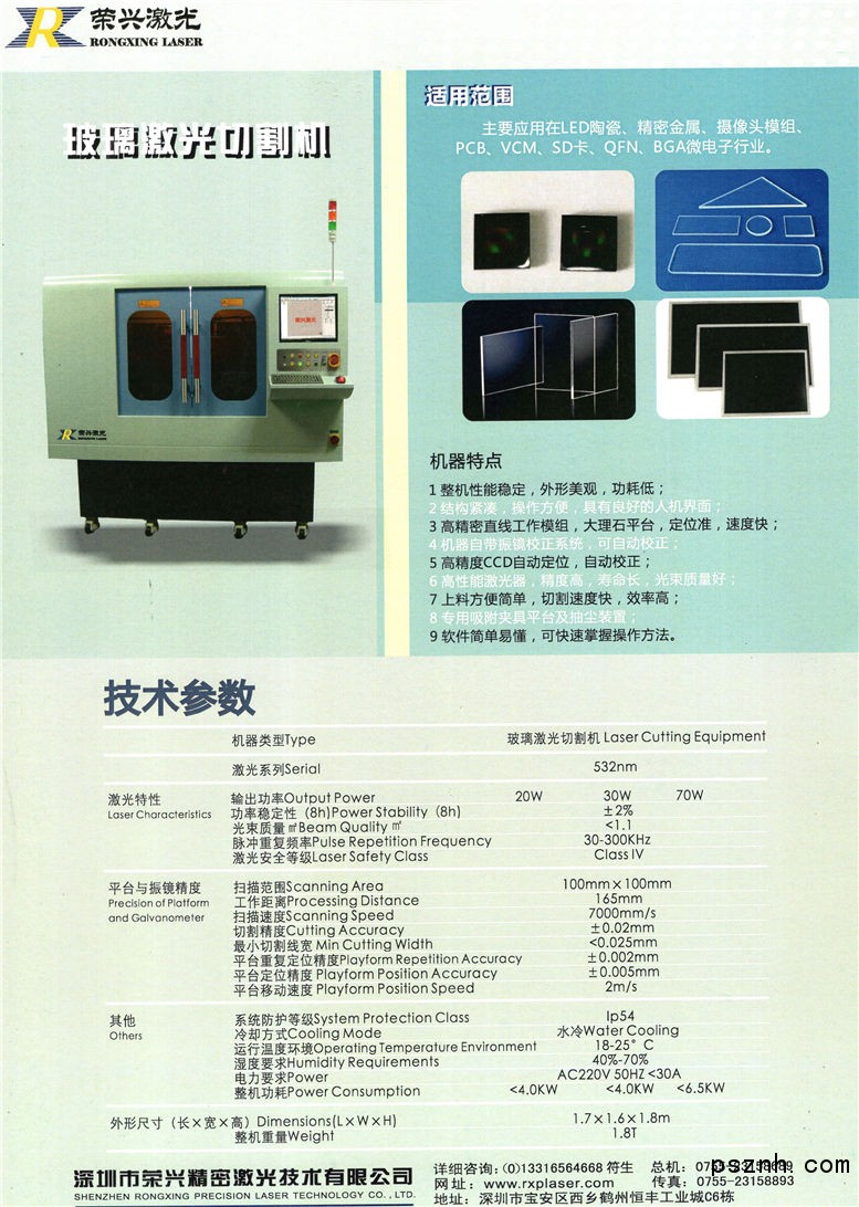 经多年的努力,荣兴己开发出系列打标系统、高精密精微激光打点机、精密调阻机、激光打孔机、高精密高速度激光切割系统、高速度在线飞行激光打码机、多轴多韦度激光焊接机。广泛应用于微电子、汽车、通讯器材、医疗器材、电脑周边、量测器材、钟表、眼镜、背光模组、显示屏玻璃切割、软版线路切割、太阳能硅片切割及划线、SMT模版精密切割、珠宝首饰钟表眼镜光通讯器件等精密焊接、模具立体雕刻等。