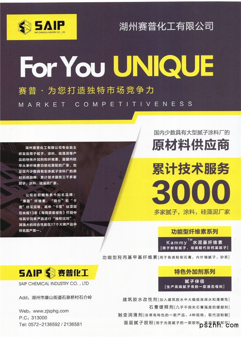 - 赛普化工重视技术开发和知识产权建设;重视培养和建设不同年龄层次的可持续发展的研发创新团队,瞄准世界最先进的阻燃技术积极建设自己的产品体系和品质管理体系;重视人才团队建设和专业技术开发创新,建立起一整套完整的技术管理制度,搭建良好的市场和售后服务网络。公司上下都秉着诚信、稳健、执着的工作态度,竭诚为广大新老客户提供优质的产品和优良的服务,您的要求是我们唯一的目标