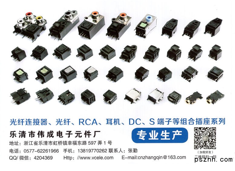 乐清市伟成电子元件厂座落于浙江温州国家级自然保护区雁荡山麓——清江镇,是一家生产GQ光纤端子系列、RCA同芯插座系列、DIN微型端子系列、SAV、SAVG音视频组合端子系列、PIN微型电源端子系列、SCART 11芯、 21芯 、42芯插座系列、AC、DC电源插座系列、2.5、3.5、6.35插座系列、WP型外接线插座系列、接线柱插座系列、音视频音响连接线系列等几十种系列产品的专业生产制造商。产品广泛用于电视机、机顶盒、电冰箱、影碟机、电脑、音响等家用电器和数码产品设备。