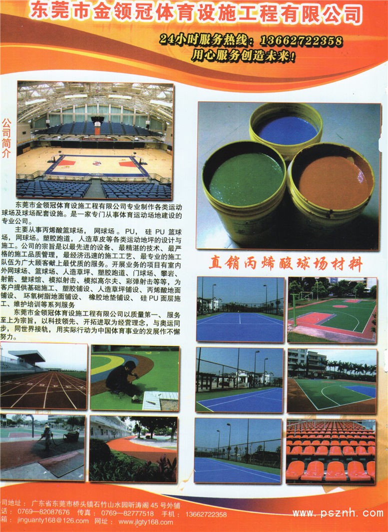 金领冠公司坐落在东莞市东部工业园桥头镇石竹山水园,环境优美,交通便利。近年来在激烈的市场竞争中恪守"质量第一,全员参与,持续改进,顾客满意"的质量方针,应用独特的体育场地新产品,凭借一流的信誉赢得了市场,业务不仅遍布全国各地,更辐射到新加坡、马来西亚等东南亚地区。