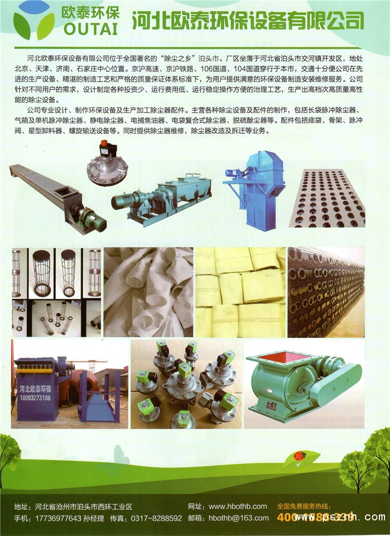 河北欧泰环保设备有限公司专业生产各类除尘布袋,除尘骨架,布袋除尘器,收尘器及各种除尘器配件系列,我企业以人为本,产品以质取胜,售后服务一流赢得广大用户的好评,所有产品行销全国及打入国际市场。本厂产品品种质量均处于国内同行业先进水平,广泛应用于国内大中型企业。我厂针对不同用户的需求,设计制定各种投资少、运行费用低、运行稳定、操作方便的治理工艺,确保各治理工程达标排放,深得用户好评。我厂拥有一支训练有素的制造施工队伍,他们在先进的生产设备,精湛的制造工艺和严格的质量保证体系引导下,为用户提供满意的制造安装与维修服务。本公司技术设备先进,配有从国外引进的全套专用设备,下设滤袋,骨架,脉冲阀,文氏管吊挂,电气控制柜,卸料器,电除配件,电动元件,气缸等生产车间,产品质量均处于国内同行业领先水平,产品畅销二十多个省,自治区,能够适应激烈的国内外市场竞争,成绩属于过去,创新成就未来。