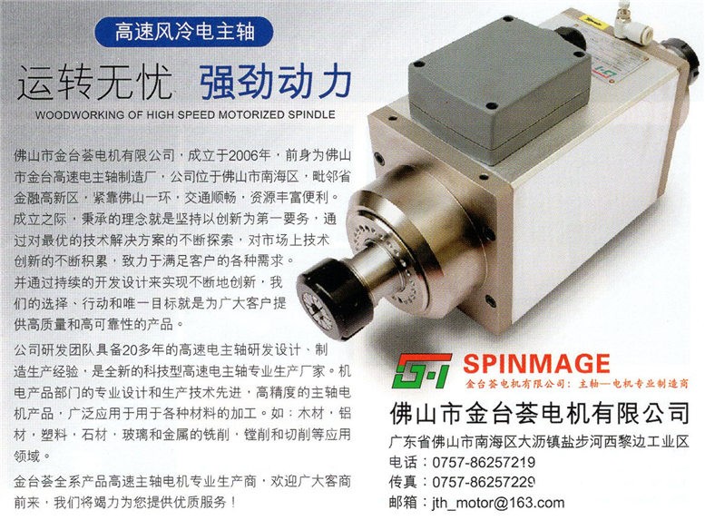 我们的团队具备20多年的高速电主轴研发设计,制造生产经验,是全新的科技型高速电主轴专业生产厂家,机电产品部门的专业设计和生产技术先进,其高精度的功能部件,广泛应用于用于各种材料的加工(木材,铝材,塑料,石材,玻璃和金属的铣削,镗削和切削应用)。