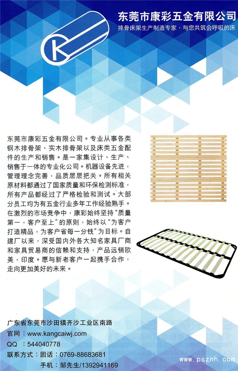 东莞市康彩五金有限公司(前:成裕五金厂)成立于2010年。专业从事高中低档排骨架、床板、冲压件以及家具五金配件的生产和销售。是一家集设计、生产、销售于一体的专业化公司。机器设备先进,管理理念完善,品质层层把关。所有相关原材料都通过了国家质量和环保检测标准,所有产品都经过了严格检验和测试。大部分员工均为有五金行业多年工作经验熟手。在激烈的市场竞争中,企业始终坚持“质量第一,客户至上”的原则,始终以“为客户打造精品,为客户省每一分钱”为目标。自建厂以来,深受国内外各大知名家具厂商和家具贸易商的信赖和支持,产品远销国内外。愿与新老客户一起携手合作,走向更加美好的未来。