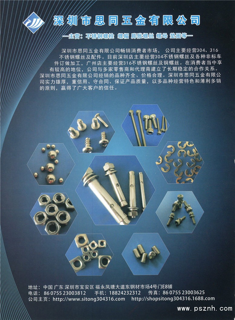 深圳市思同五金有限公司畅销消费者市场, 公司主要经营304 316不锈钢螺丝及配件。目前深圳店主要经营304不锈钢螺丝及各种非标车件订做加工,广州店主要经营316不锈钢螺丝及铜螺丝。在消费者当中享有较高的地位,公司与多家零售商和代理商建立了长期稳定的合作关系。深圳市思同五金有限公司经销的品种齐全、价格合理。深圳市思同五金有限公司实力雄厚,重信用、守合同、保证产品质量,以多品种经营特色和薄利多销的原则,赢得了广大客户的信任。