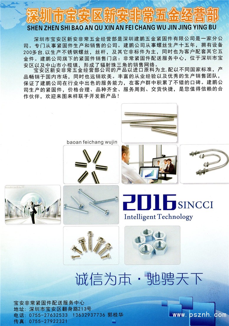 深圳市建鹏五金紧固件有限公司是一家专门从事紧固件生产和销售的公司。建鹏公司从事螺丝生产十五年,拥有设备200多台,以生产不锈钢螺丝,丝杆,及其它非标件为主,同时也为客户配套其它五金件。建鹏公司旗下的紧固件销售门店:非常紧固件配送服务中心,位于深圳市宝安区以及中山市小榄镇,形成了辐射珠三角的销售网络。