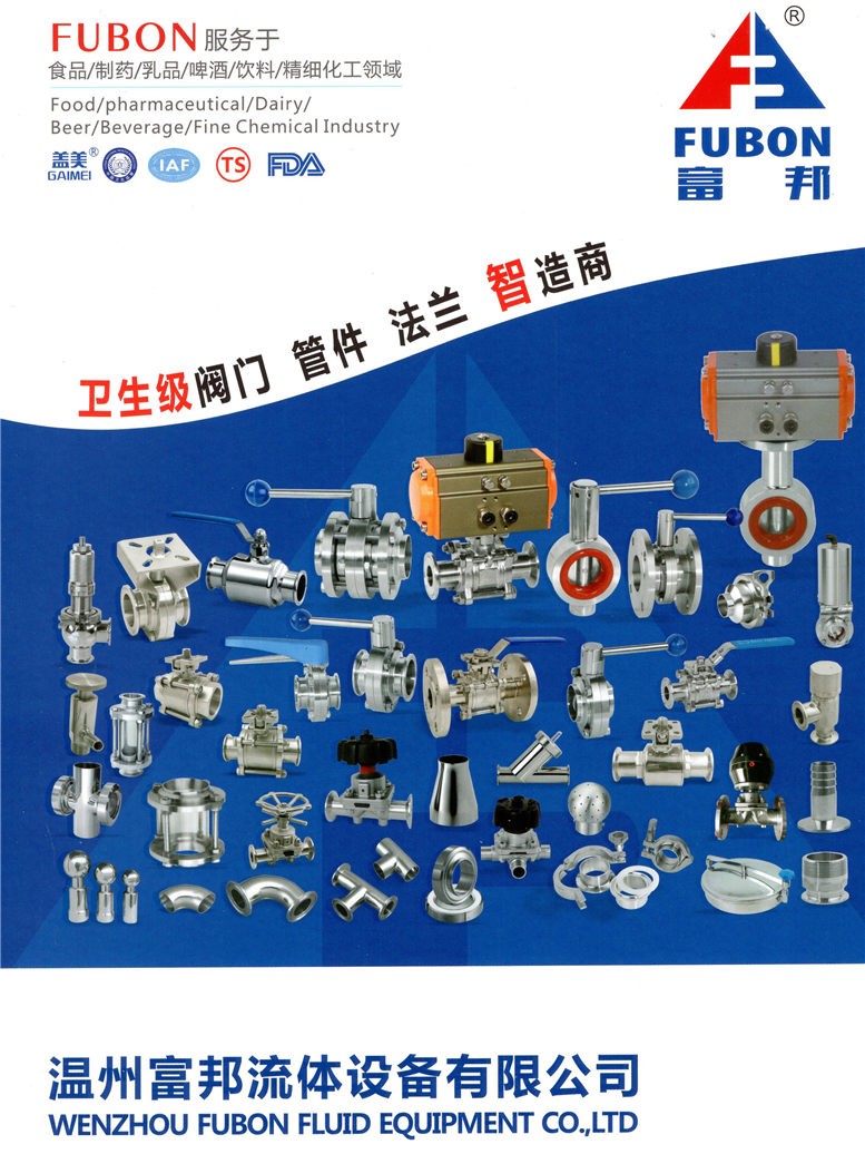 公司拥有自营进出口权和生产能力,公司已具备多台优质的数控车床、加工中心和检测设备。并通过TS认证、浙江省涉及饮用水卫生安全产品许可认证、FDA检测报告、IS09001:2008国际质量管理体系 认证,以可靠的质保体系和公司技术精湛的生产管理团队,生产出让客户满意的产品。卫生级阀门和管件符合3A、SMS、DIN、ISO、IDF。公司主要产品有:卫生级蝶阀、隔膜阀、止回阀、球阀、自控阀门、活接头、管件等。产品广泛应用于制药、饮料、食品、啤酒、精细化工、水处理等行业领域,并获得广大用户的认可和好评。