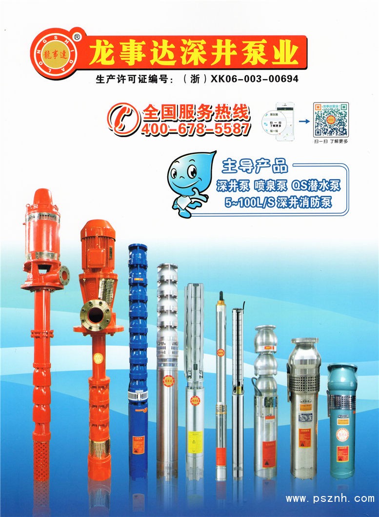 龙事达深井泵业有限公司主要生产:75QJ、85QJ、95QJ、100QJ、125QJ、150QJ、175QJ、200QJ、250QJ、300QJ、350QJ系列深井泵,QS潜水泵,SP系列不锈钢深井泵,QSP喷泉泵,QJR热水泵,海水泵,XBD-Q消防泵等系列产品,流量从1m3/h-600m3/h,扬程从2m-600m,电机额定功率从0.37kw-125kw,用户需要特殊规格可代为设计制造。产品广泛用于农村、城市、家庭、市政工程、煤矿、河塘、高楼及无塔供水器配套,主要特点是:充水式电动机、滑动轴承运转,只要在电机中注满清水,即可正常运转。主要优越性是:运行可靠、经久耐用、使用方便、功率大、故障少,维修费用低等.