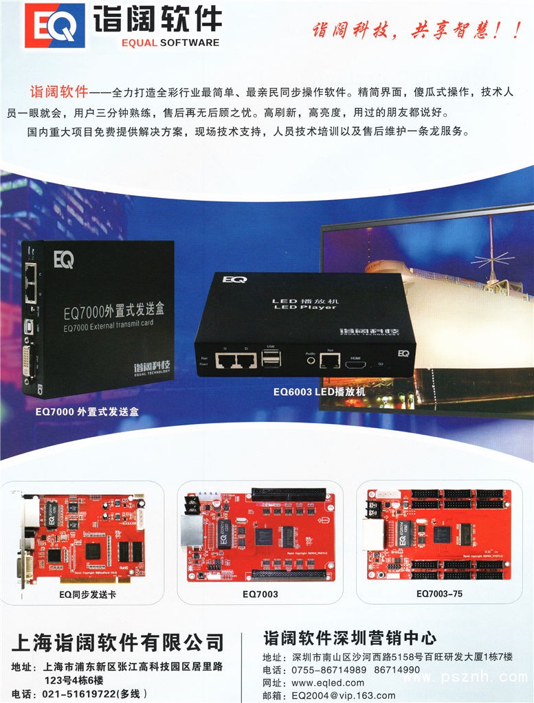数年来,我们相继推出了“EQ条屏控制系统”、“EQ图文控制系统”、“EQ一卡通”串口和网络方式控制系统以及“EQ一彩通”异步全彩和“EQ直播室”同步全彩控制系统等几大系列产品,均得到了行业内用户、尤其是终端用户的热烈欢迎和好评。我们正在努力用行动更专业、更快速、更亲切地成为各大LED 显示屏厂家、分销商和广大用户的不二选择。