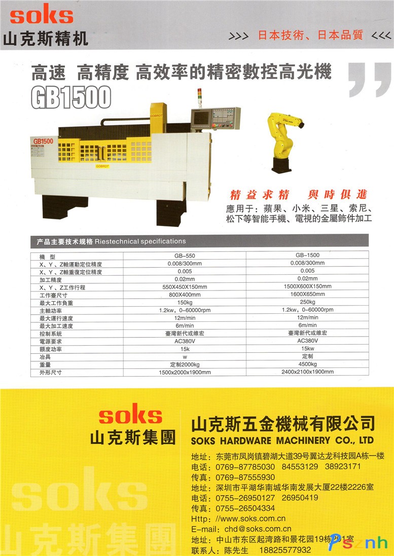 2010年8月与世界知名机械品牌日本FANUC合作,于东莞市凤岗镇碧湖大道翼达龙科技园A栋一楼,为广大新老客户提供高性能高性价比放电线切割机,钻攻中心机,镜面放电火花机,高速细孔打孔机销售及服务,帮助企业加速转型升级,提高企业核心竞争力;加速山克斯品牌为广大顾客服务的步伐。
