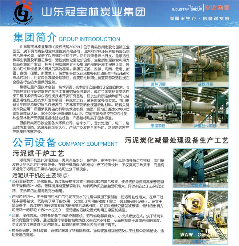 山东冠宝林炭业集团有限公司位于青岛胶州市胶北国际工业园恒瑞路,总投资2000万元,注册资金3100万元,总占地面积20000平方米,是一家活性炭及滤料综合性生产厂家,拥有国际先进技术的斯列普炉和自主研发的活化回转炉、炭化炉,各种专业设备和破碎筛分设备等十几座全自动生产设备及专利技术,是专业生产木质类、煤质类、高新技术应用行业用炭的专业生产厂家,并常年与各科研机构、院校进行深度研发合作。