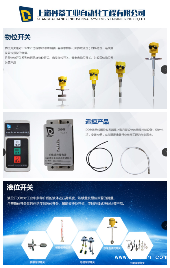 上海丹蒂工业自动化工程有限公司成立于2008年5月是一家集物/液位仪表研发,生产,营销和服务于一体的专业仪器仪表公司。公司主要产品包括各类物/液位传感器,压力/温度/流量和气动助流设备等,广泛运用在各类工厂的各种环境中,能全方位的满足客户的控制要求。
