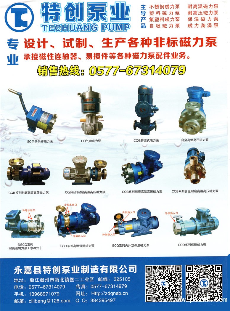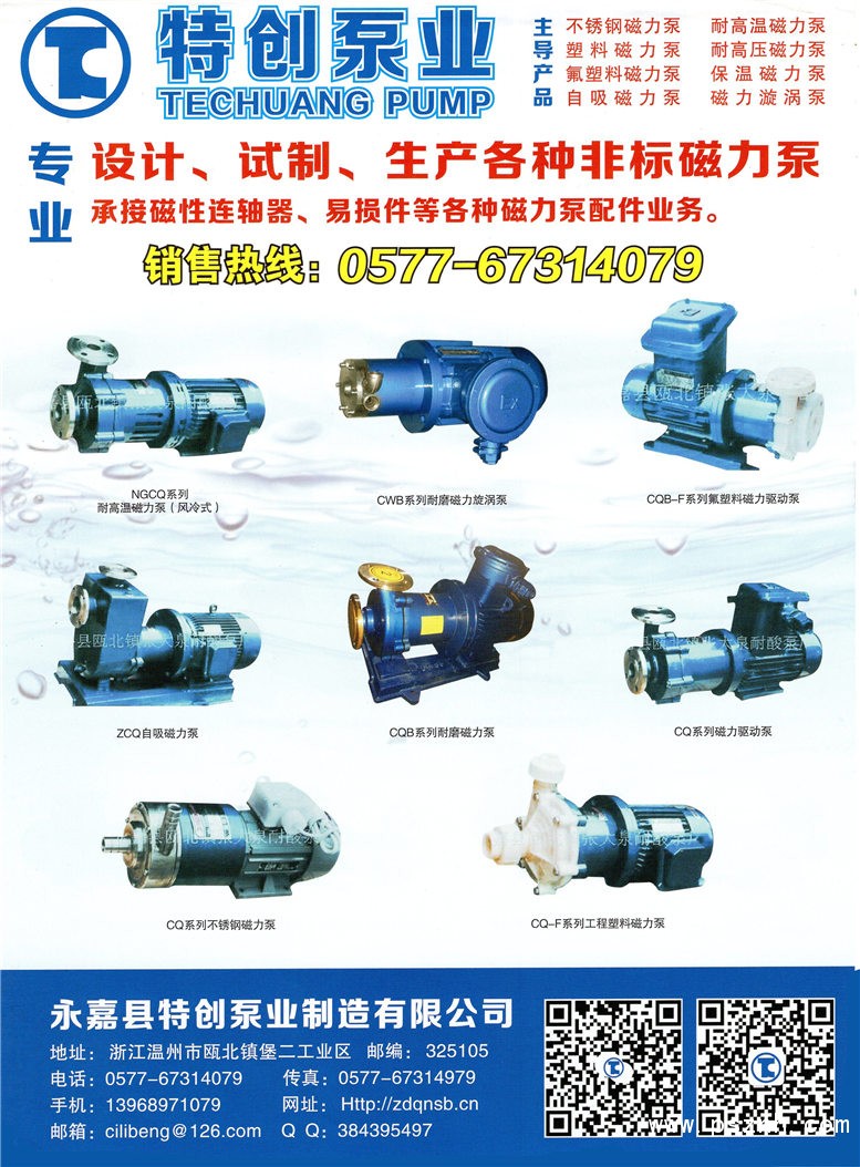 本厂专业从事工业泵的开发、设计、生产、销售及售后服务。主导产品为各种磁力驱动离心泵(以下简称磁力泵)。该磁力泵设计独特、小巧轻便、工艺先进、无轴封、耐腐蚀、不泄露。