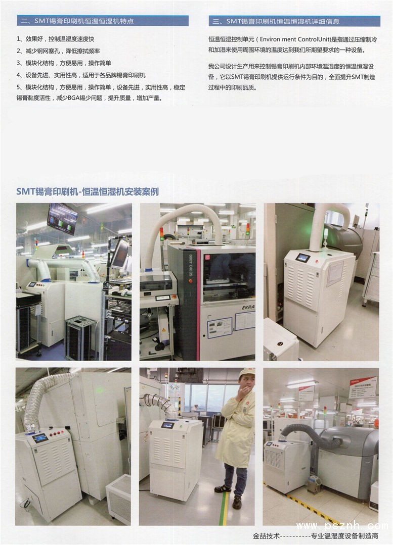 东莞市金喆电子科技有限公司是一家多年从事机电设备的开发、生产销售及服务于一体的设备供应商。工业加湿器、工业除湿机、超声波加湿器、工业湿膜加湿器、工业超声波加湿器、工业抽湿机、厂房除湿机、仓库除湿机设备研发、设计生产、拥有先进的空调加湿应用技术,拥有新一代空调加湿器的新标准。2007年成立,在东莞和深圳有标准制造工厂,是工业加湿器,除湿机模块化生产销售服务于一体设备供应商。 公司主要产品有:直排水式湿膜加湿器、循环水式湿膜加湿器、风管湿膜加湿器、电动干蒸汽加湿器、高压喷雾加湿器、机房专用加湿器、汽水混合加湿器、高压微雾系统、工业超声波加湿器、户式中央空调专用加湿器、加湿器、冷库气调库专用加湿器、超市保鲜专用加湿器、纺织厂专用加湿器、车载加湿器等几大系列,加湿量0.2kg/h~3000kg/h,满足各种场所对湿度的要求。大量配套供应中央空调生产厂商、空调安装工程公司,可广泛应用于半导体电子设备厂房、光纤、电子、烟草行业、净化行业、电池行业、纺织厂、喷漆厂、印刷厂、造纸厂、木材厂、制药车间、计算机房、程控机房、电信机房、精密机械、精密机房、仪器仪表、图书室、实验室、美术馆、博物馆、医院手术室、地下工程、电脑室、资料室、档案馆、保龄球馆、库、储藏、家庭、写字楼、宾馆公寓饭店、气调库、大棚、菌种培植、温室、食品加工车间等中央空调系统加湿或空间直接加湿(保湿、恒湿、回潮、降温、消毒、保鲜、储藏、降尘、除静电、云雾景观、美容护肤)实现对生活环境的舒适性加湿和生产加工测试储运环境的工艺性加湿。 金喆电子“以人为本”,信奉“诚信、创新、专业、精致”之生存和发展理念及“节约节能,环保家园”的企业宗旨,凝聚一大批高素质的专业设计工程师及熟练的生产技师队伍。公司的经营理念是:聚集专业的人才,凭借先进的技术,采用可靠的产品,提供完善的服务! 公司愿以真诚的态度、优质的品质、完善的服务、不断创新、期待与广大国内外客户的良好合作,同时也衷心地期待与广大同行共同发展壮大。