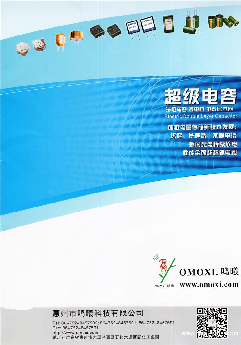 深圳市鸣曦电子有限公司,(简称“鸣曦电子”,OMOXI)成立于2005年,位于广东省深圳市,是一家专业生产销售超级电容、法拉电容、金电容的厂家。本公司专业于超级电容的研发,生产,应用与销售。我司于2005年获得韩国高奇普(KORCHIP)授权一级代理,销售旗下全系列产品;并与以色列企业合作,生产销售(supercapchip)超薄片式、高功率、超低内阻(毫欧级)、超低漏电流型超级电容。公司产品除了提供给国内多个省市、地区的市场,还远销中东、欧洲、北美和东南亚,同时兼顾内外贸市场。本公司产品定位高端品质,产品线齐全,包括有机系,水系产品,是目前国内专业于超级电容的公司,提供产品系列多,并提供解决方案,技术选型支持,设计优化建议。主要产品系列有:钮扣式、柱式(卷绕式)、方片式、方块型、圆筒型、模组等。产品应用领域:安防门禁、生物识别、智能电网、智能水电气表、太阳能、工控自动化、高端玩具、无线通讯、GPS、车载电子、无线导航 、电池保护......应用实例:汽车电子(车载音响、导航仪、记录仪),智能监控,水电气表,照明能源,瞬间高功率、脉冲电路,太阳能转换,物联网RF-ID,能量保存,时钟记忆电路,电源开关、电动遥控、数码电子闪光......我们不但提供高端品质的超级电容,而且协助客户设计选型,提供性能价格比最好的解决方案。需要了解更多超级电容的产品方案,应用技术,商务合作,欢迎浏览公司官方网站——www.omoxi.com或www.birdsong.cn.alibaba.com/ )深圳市鸣曦电子有限公司(OMOXI),提供法拉电容系列:DT(OMC/OMG/OMK), OFTG, DA, SM/DMS、 DCS/DCL、 DR/ HP/SR、DP、 DRM /HPMDL/DXL、 Modules(模组)。我们将提供测试样品,质量客户评定!买卖不成仁义在,欢迎联系、咨询。客户满意,是对我们最大的肯定!声明:我们能做到的才保证,做不到的绝不夸大、吹嘘去忽悠客户。诚信为本,用心服务。