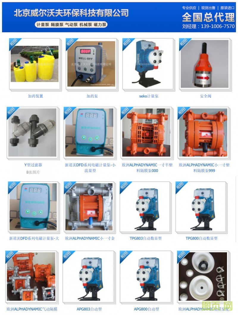 北京威尔沃夫环保科技有限公司 经销批发的计量泵、隔膜泵、气动泵、机械泵、磁力泵畅销消费者市场,在消费者当中享有较高的地位,公司与多家零售商和代理商建立了长期稳定的合作关系。北京威尔沃夫环保科技有限公司经销的计量泵、隔膜泵、气动泵、机械泵、磁力泵品种齐全、价格合理。北京威尔沃夫环保科技有限公司实力雄厚,重信用、守合同、保证产品质量,以多品种经营特色和薄利多销的原则,赢得了广大客户的信任。 主营产品 意大利SEKO计量泵、蠕动泵、水质分析仪表 欧洲原装ALPHADYNAMIC气动隔膜泵 威尔牌机械隔膜计量泵、电磁隔膜计量泵 加药装置及配件。