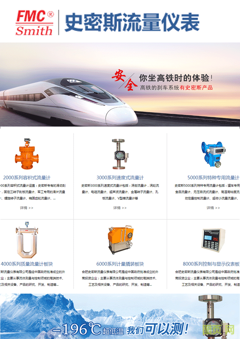 公司制造的PD正位移系列:SMITH2011固定金属刮板(三转子)流量计、SMITH2012滑动金属刮板流量计、SMITH2013螺旋转子流量计、SMITH2014椭圆齿轮流量计、SMITH2015罗茨腰轮流量计以及速度式流量计系列:SMITH3011旋涡流量计、SMITH3012透平(涡轮)流量计、SMITH3013电磁流量计、SMITH3014金属转子流量计、SMITH3016“V”型锥钝体流量计;SMITH4000系列质量流量计和多种专用流量计;史密斯210电液阀、计量泵、计量撬等设备,广泛应用于石油、化工、食品、医药、军工、科研等部门的液体、气体的精确计量与控制。