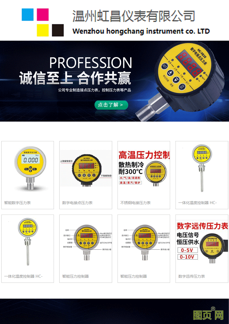 温州虹昌仪表有限公司是压力表等产品专业生产加工的公司,拥有完整、科学的质量管理体系。温州虹昌仪表有限公司的诚信、实力和产品质量获得业界的认可。欢迎各界朋友莅临参观、指导和业务洽谈。 本公司坚持“求真、奉献”的经营方针,严格的质量保证体系,在新的世纪里,我们将遵循“创新、进取、严谨”的宗旨和以“优良品质、精益求精”的锐意进取的企业精神,至上的产品,为您的企业腾飞添翼。精心做好每件产品、至上的的品质,将一种敬业的态度、专注的精神、熟练的做法,良好的信誉融入到服务的细节。