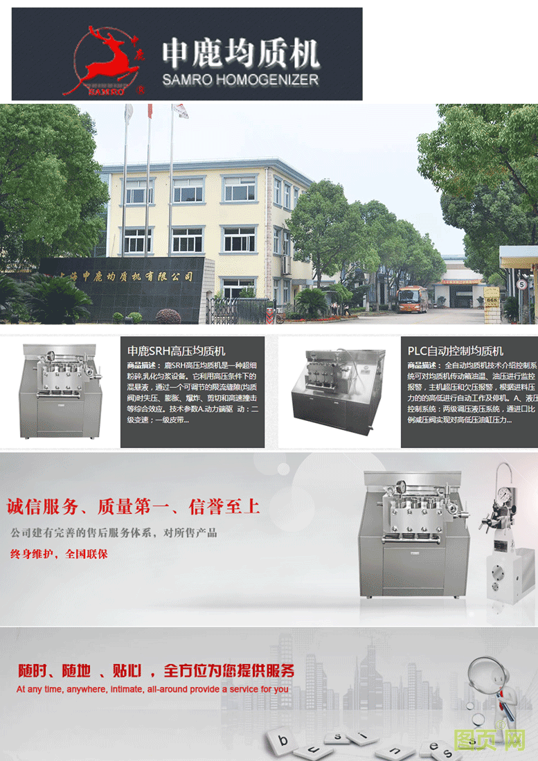 上海申鹿均质机有限公司是均质机和高压泵科研、生产、销售和服务为一体的专业公司,地处上海市西大门,新厂区占地50亩,紧靠F1上海国际赛车场。公司拥有多位资深专家和科技生产骨干,并以扎实的均质理论和二十余年研发的丰富经验,再次创造的申鹿牌系列高压均质机。产品经十余年市场挑战,以其流星充足,压力稳定,均质效果好,易损件寿命长,节能、低噪声等特点,成为全国著名品牌。成为我国乳品、饮料等驰名企业的普遍首选用机,并在精细化工、造纸、染米斗和制药等行业中广泛应用。产品出口欧、美、非及东南亚诸国。