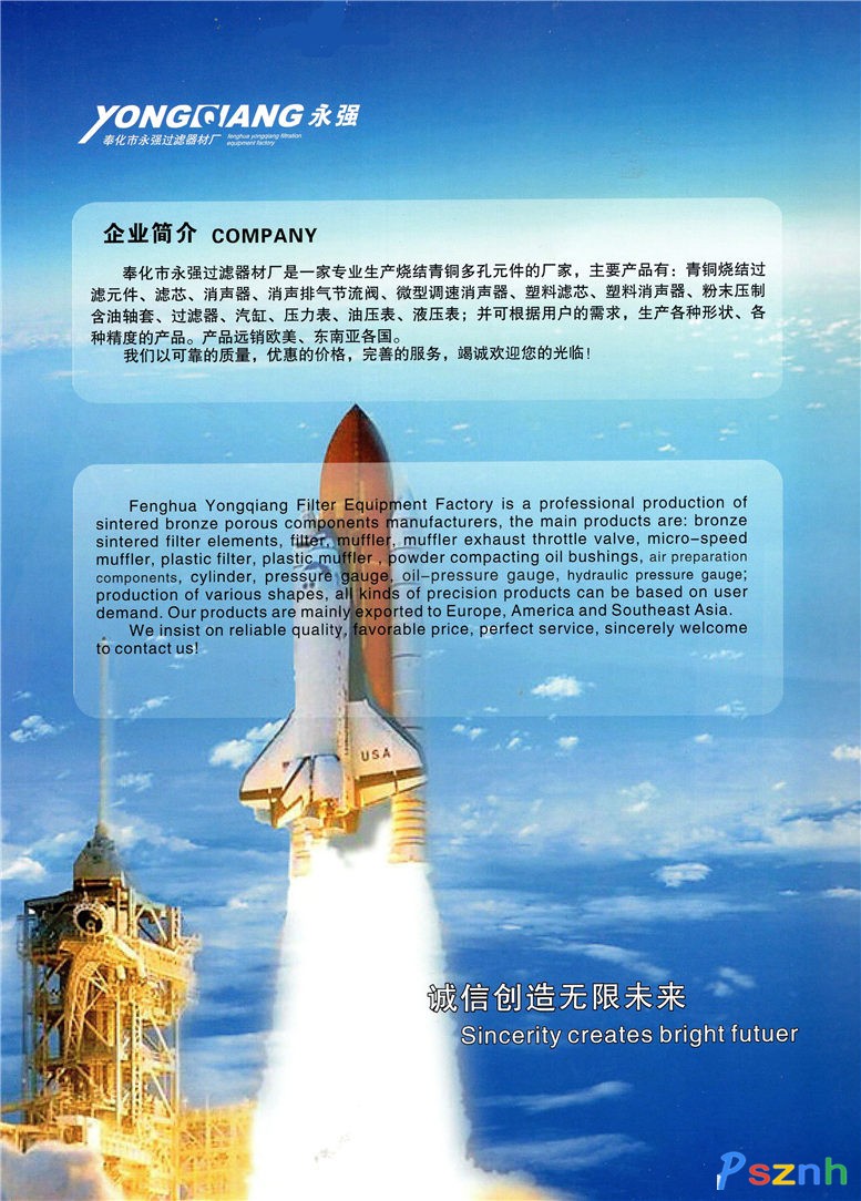 宁波市奉化永强过滤器材有限公司, 具体地址是 浙江省 浙江奉化市萧王庙街道金河路88号,联系人是夏旭阳。联系手机是浙江奉化市萧王庙街道金河路88号,主要经营压力表,消声器,压力表,消声器,粉末铜套,钢板铜套。单位注册资金未知。我司是一家从事制造仪表仪器,集开发、经营、销售为一体的企业,主营产品:仪器仪表 压力仪表 压力表 !公司以价格、质量、技术综合优势遍销全国各地。