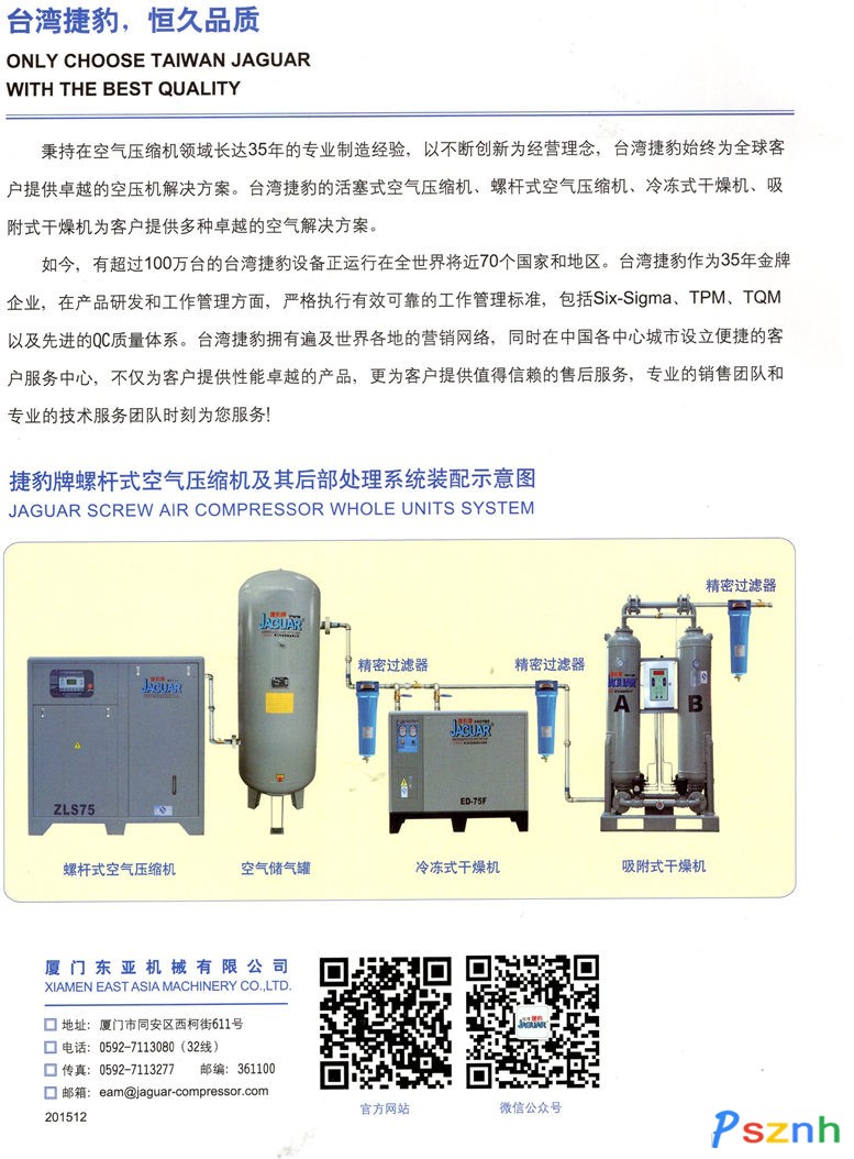 秉持在空气压缩机领域长达35年的专业制造经验,以不断创新为经营理念,台湾捷豹始终为全球用户提供卓越的空气压缩机解决方案。台湾捷豹的活塞式空气压缩机、螺杆式空气压缩机、冷冻式干燥机、吸附式干燥机为客户提供多种卓越的空气解决方案。