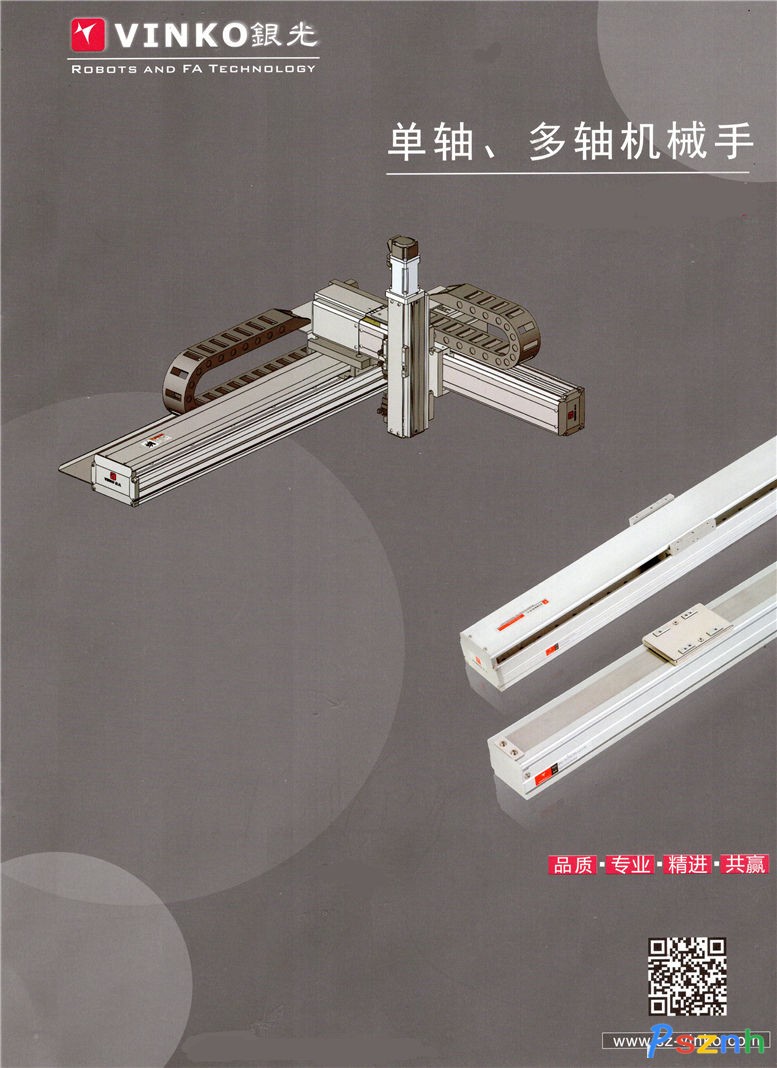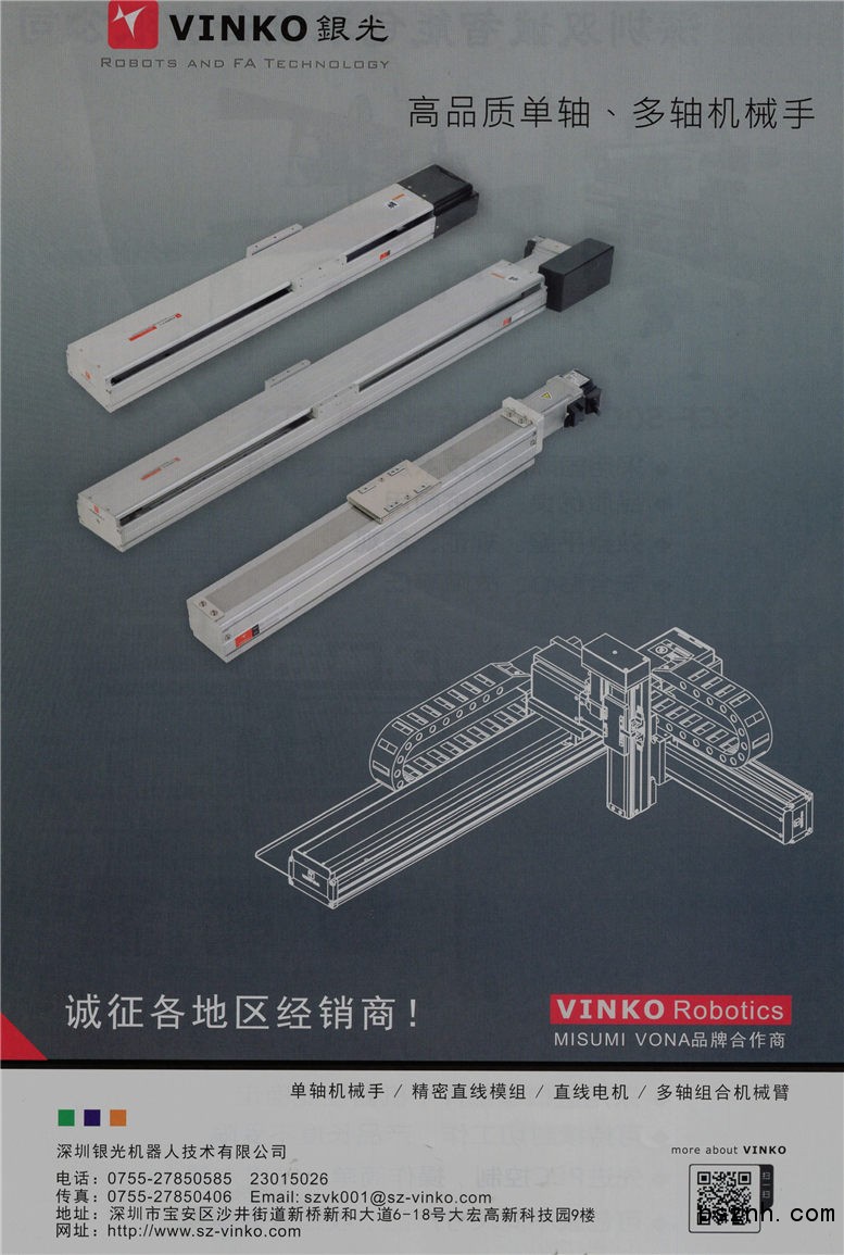 深圳银光机器人技术有限公司 (简称:银光 / VINKO) 是一家专注于工业机器人和自动化领域研究和开发的高新技术企业。2009年,银光率先在国内开发出单轴、多轴机械手臂,经过多年潜心研究和技术积淀,银光已经成为国内单轴机械手臂和直角坐标机器人中高端知名品牌。产品在富士康(Foxconn),华为(Huawei),比亚迪(BYD),美的(Midea)等知名企业及其自动化设备供应链中占据领先地位。"品质过硬+贴心服务"成为银光人对客户和市场最深刻的理解,同时也是最朴素的追求。作为中国单轴、多轴机械手臂的领导者和标杆品牌,银光期望通过更多高品质的产品和服务为中国自动化核心零部件做出贡献。