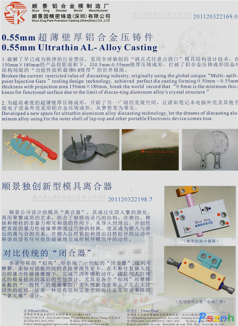 公司2001年通过BSI认证公司ISO9001:2000质量体系认证,2007年通过ISO14001环境管理体系认证,2008年通过NQA TS16949管理体系认证。公司设备先进、齐全,同时,拥有一支高效稳定的专业技术队伍,和傲视业界的压铸模具结构设计技术以及多项突破传统的设计专利。所加工的产品涉及应用于电子、机械、灯饰、医疗、汽车等各行各业,能满足客户高装饰性、高精密度的特殊要求。