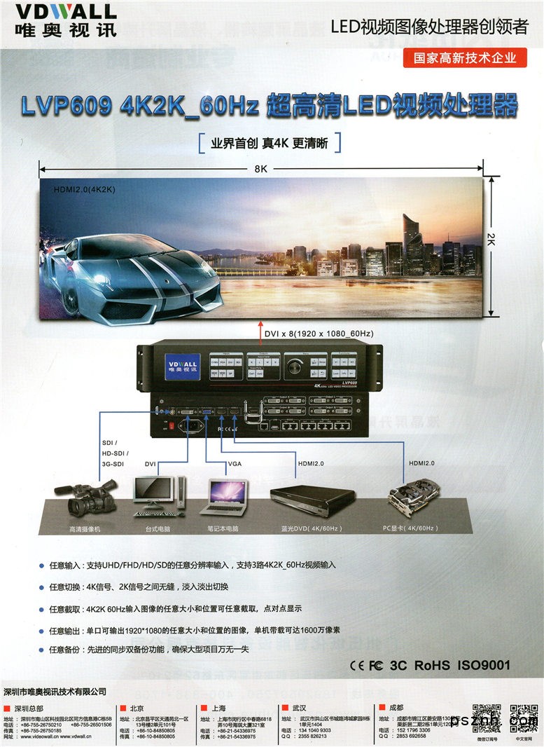 公司建立了完善的质量管控体系,产品通过CE、FCC、CCC、RoHS和ISO9001等多项认证,成为许多大型招标项目指定专用设备。从2012年行业评选开始已连续四年蝉联行业“十佳LED周边设备品牌”评选第一名!