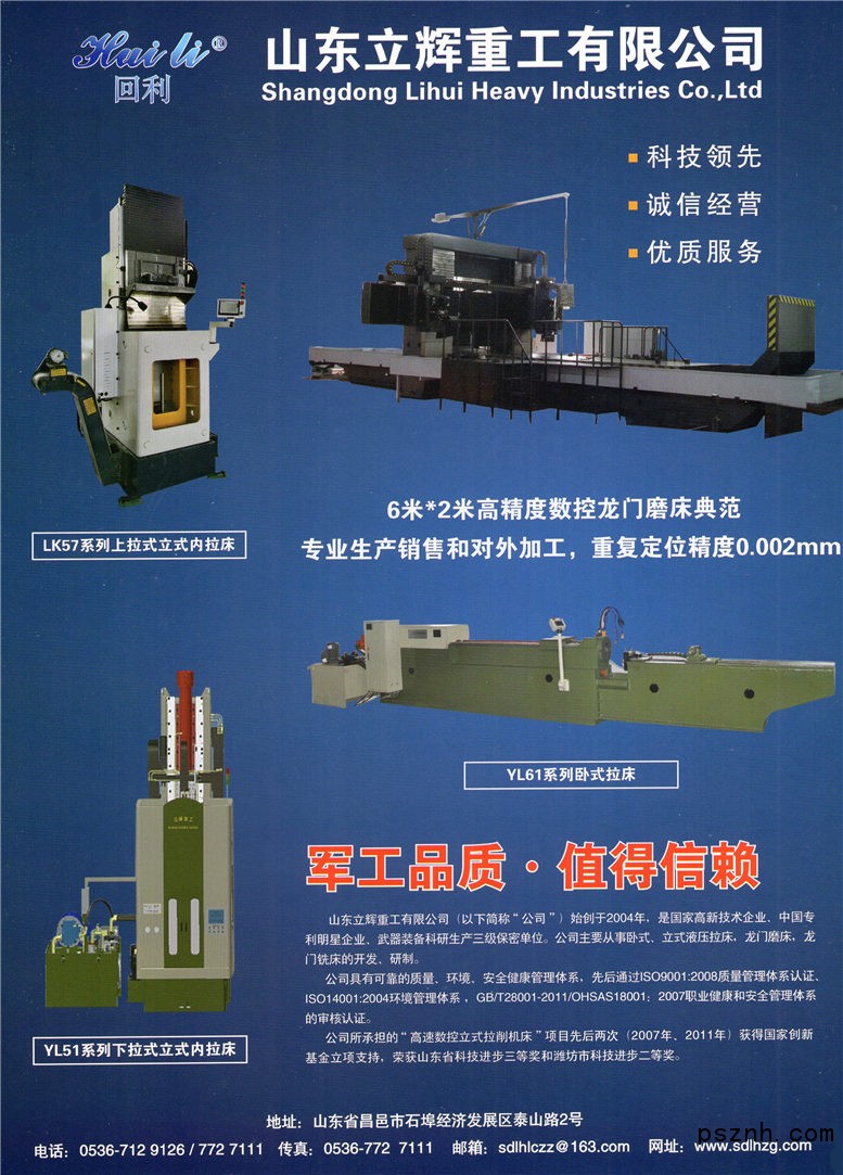 山东立辉重工有限公司(以下简称“公司”)始创于2004年,是山东省高新技术企业、中国专利明星企业、武器装备科研生产三级保密单位。公司主要从事卧式、立式液压拉床的开发、研制、经营活动,公司所承担的“高速数控立式拉削机床”项目先后两次(2007年、2011年)获得国家创新基金立项支持,荣获山东省科技进步三等奖和潍坊市科技进步二等奖。