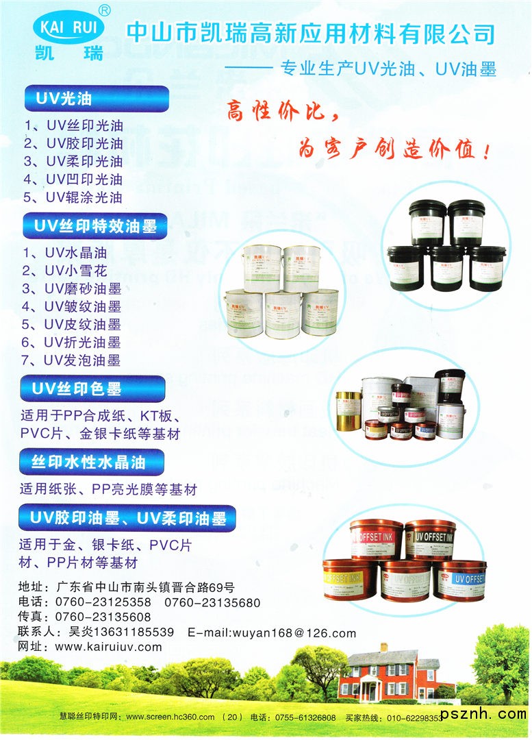 中山市凯瑞高新应用材料有限公司是一家高科技型民营企业。公司致力于绿色环保,高效节能的UV应用材料的研发和生产,是UV光油,UV油墨的专业制造商。目前主要产品:各类UV光油,丝印UV油墨,胶印UV油墨,柔印UV油墨,UV逆向底油,广泛应用于烟酒包装,牙膏盒,礼品盒,标签,广告和宣传画,挂历,贺卡等印刷。