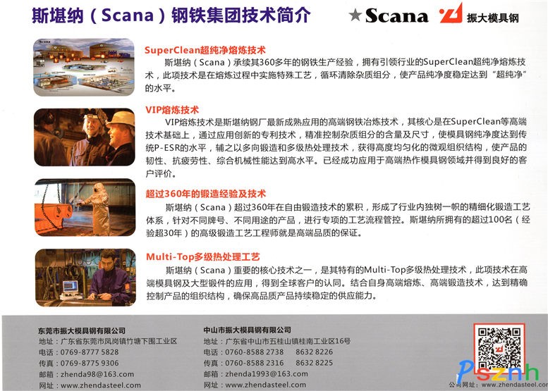 东莞市振大模具钢有限公司成立于1993年。经过20年的发展,振大成为模具钢领域的领跑者。2014年1月,经过瑞典斯堪纳(Scana)钢铁公司半年的考核,振大公司获得“Scana”这个世界顶级品牌工具钢的首批广东代理权。这是振大人多年来真诚付出的回报,也是斯堪纳对振大一直信奉“诚信经营,物尽所用”价值观的认同。斯堪纳与振大携手同行,为中同客户提供最优的模具解决方案,共创美好未来。