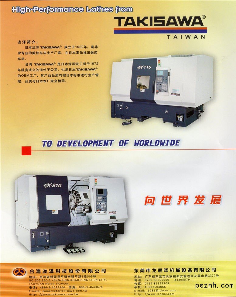 东莞市龙辰晖机械设备有限公司是泷泽科技股份有限公司在中国大陆设立的唯一销售服务中心。公司主营日本泷泽、台湾泷泽、上海欣泷泽CNC数控车床的销售及维修服务,同时也是台湾油欣立式车床、日本仓敷卧式镗铣的中国大陆总代理。