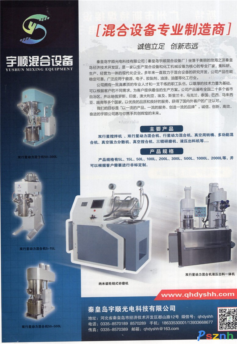 秦皇岛宇顺光电科技有限公司(秦皇岛宇顺混合设备厂)坐落于美丽的渤海之滨秦皇岛经济技术开发区,是一家以生产混合设备和化工机械设备为核心的专业厂家,集科研、生产、经营为一体的现代化企业。多年来一直致力于混合设备的研究开发,公司产品性能稳定可靠,广泛应用于能源、电子、胶黏剂、油漆、油墨等化工行业。