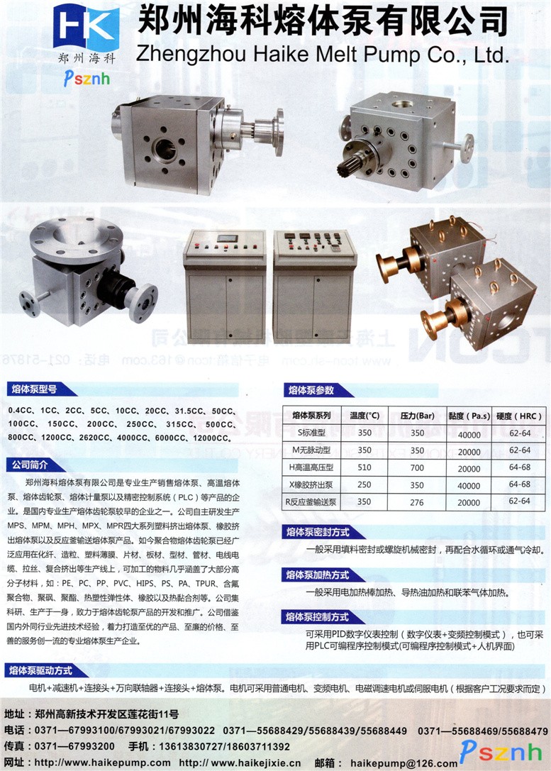 郑州海科机械总公司成立以2003年,是一家对金属工具、模具、齿轮、机械产品及齿轮精加工以及工业自动化控制研发销售的企业。随着塑料挤出行业市场的需要2005年公司独立开发熔体泵和高温熔体泵产品,并于20101月份成立郑州海科熔体泵有限公司,专业从事熔体泵、高温熔体泵、熔体齿轮泵、熔体计量泵和反应釜输送熔体泵以及精密控制系统(PLC)等产品的生产销售。海科公司具有较强的技术生产力量,自主研发生产MP-SMP-MMP-H等三大系列高温熔体齿轮泵以及MP-R系列反应釜输送泵和MP-X橡胶挤出泵产品。如今聚合物熔体齿轮泵已经广泛应用在化纤、造粒、塑料薄膜、片材、板材、型材、管材、电线电缆、拉丝、复合挤出等生产线上,可加工的物料几乎涵盖了大部分高分子材料,如:PEPCPPPVCHIPSPSPATPUR、含氟聚合物、聚砜、聚酯、热塑性弹性体、橡胶以及热黏合剂等。公司集科研、生产于一身,致力于熔体齿轮泵产品的开发和推广。公司借鉴国内外同行业先进技术经验,着力打造至优的产品、至廉的价格、至善的服务创一流的专业熔体泵生产企业。
