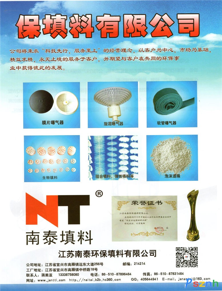 江苏南泰环保填料有限公司,位于我国闻名的环保之乡—宜兴市高塍镇,专业生产各种填料、曝气器、环保配件,已有十二年的历史。总经理杜顺明先生着重致力于研究开发各种新颖的污水处理填料及曝气系统,并已在近年来开发出部分曝气器新产品。     本厂在高塍镇拥有两个相当规模的经营部,即宜兴市方泰环保配件经营部、宜兴市欣兰水处理经营部。多年来,我们视用户为上帝,以诚信为本,以我们过硬的产品质量为基础,为全国各地的环保同行及用户提供了一批又一批质优价廉的环保配件.