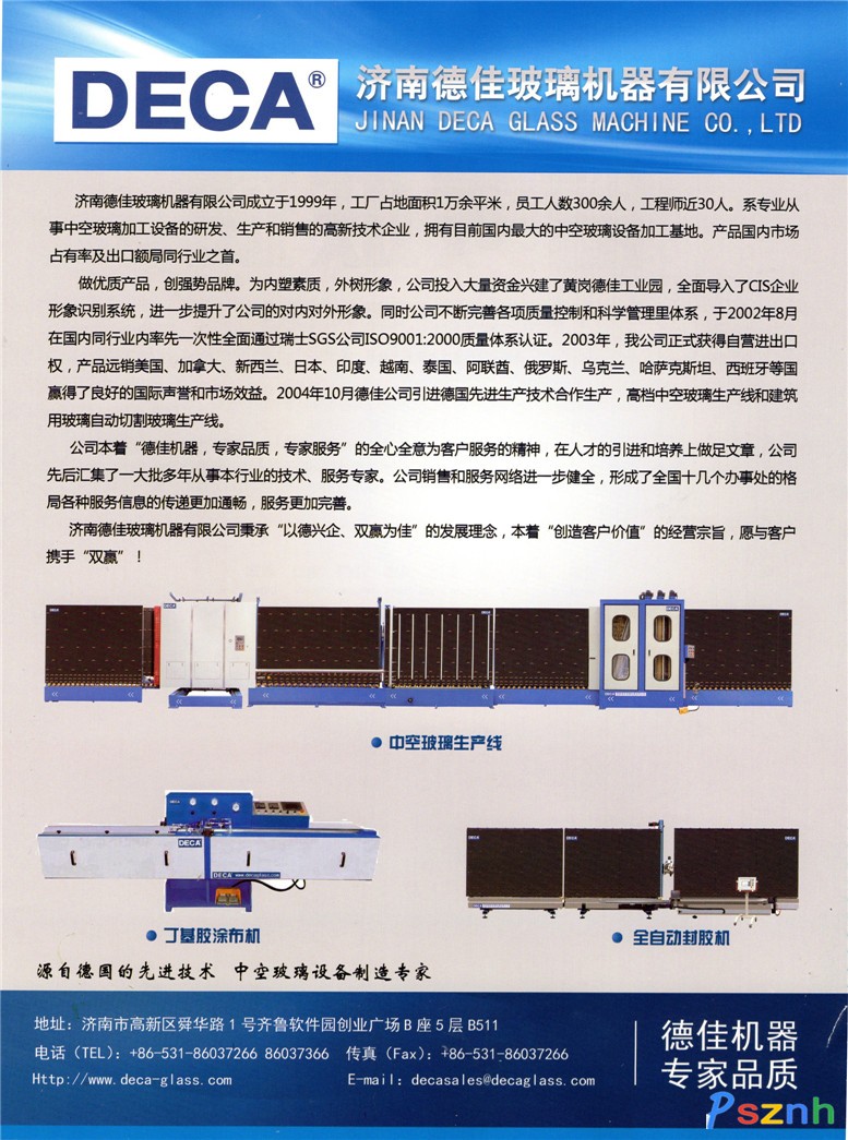 济南德佳玻璃机器有限公司成立于1999年,工厂占地面积1万余平米,员工人数300余人工程师人数近30余人。系专业从事中空玻璃加工设备的研发、生产和销售的高新技术企业,拥有目前国内最大的中空玻璃设备加工基地。产品国内市场占有率及出口额稳居同行业之首。公司于成立之初被接纳为“中国建筑玻璃与工业玻璃协会”的会员,2000年应国家检测中心邀请参与了中空玻璃行业标准的制订。